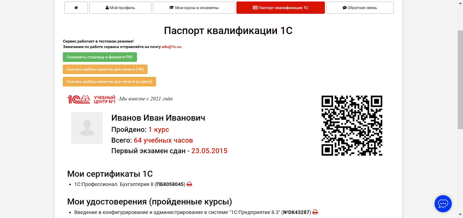 В паспорте 1C есть возможность скачать электронные версии удостоверений, полученных после прохождения курсов в 1С:Учебном центре №1, а также сертификатов 1С:Профессионал, 1С:Специалист и 1С:Специалист-консультант.