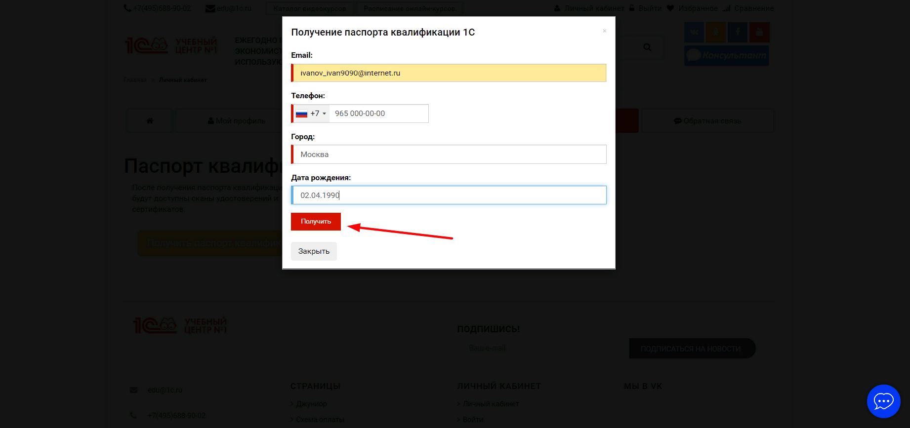 Далее, в окне «Получение паспорта квалификации 1С» необходимо заполнить личную информацию и нажать на кнопку Получить.